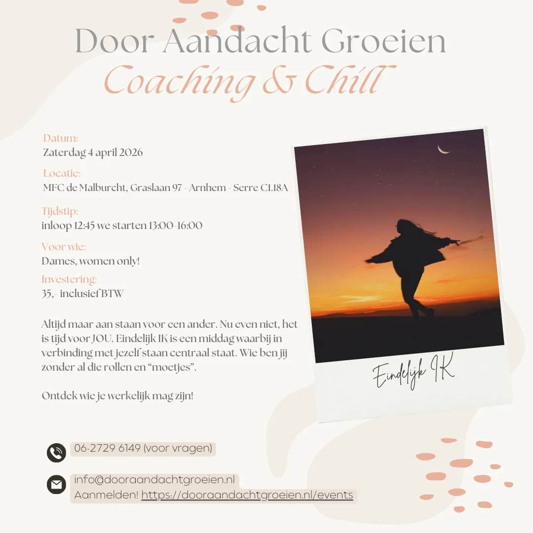 Gun jezelf een pauze van de dagelijkse sleur en kom tot rust met gelijkgestemden. Ontdek meer balans, zelfvertrouwen en innerlijke rust. Elk event biedt een thema om te leren, inzichten op te doen en kracht te vinden voor jouw volgende stap met Door Aandacht Groeien!